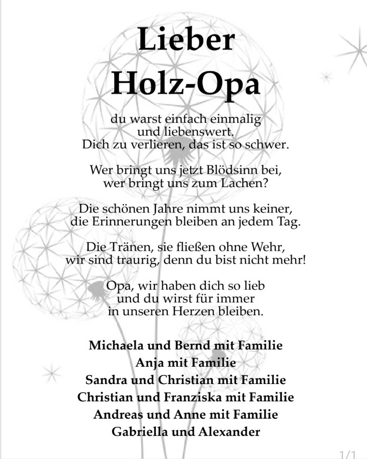 Wenn ihr an mich denkt, seid nicht traurig,sondern habt den Mut, von mir zu erzählen und auch zu lachen. Lasst mir einen Platz zwischen euch so wie ich ihn im Leben hatte.